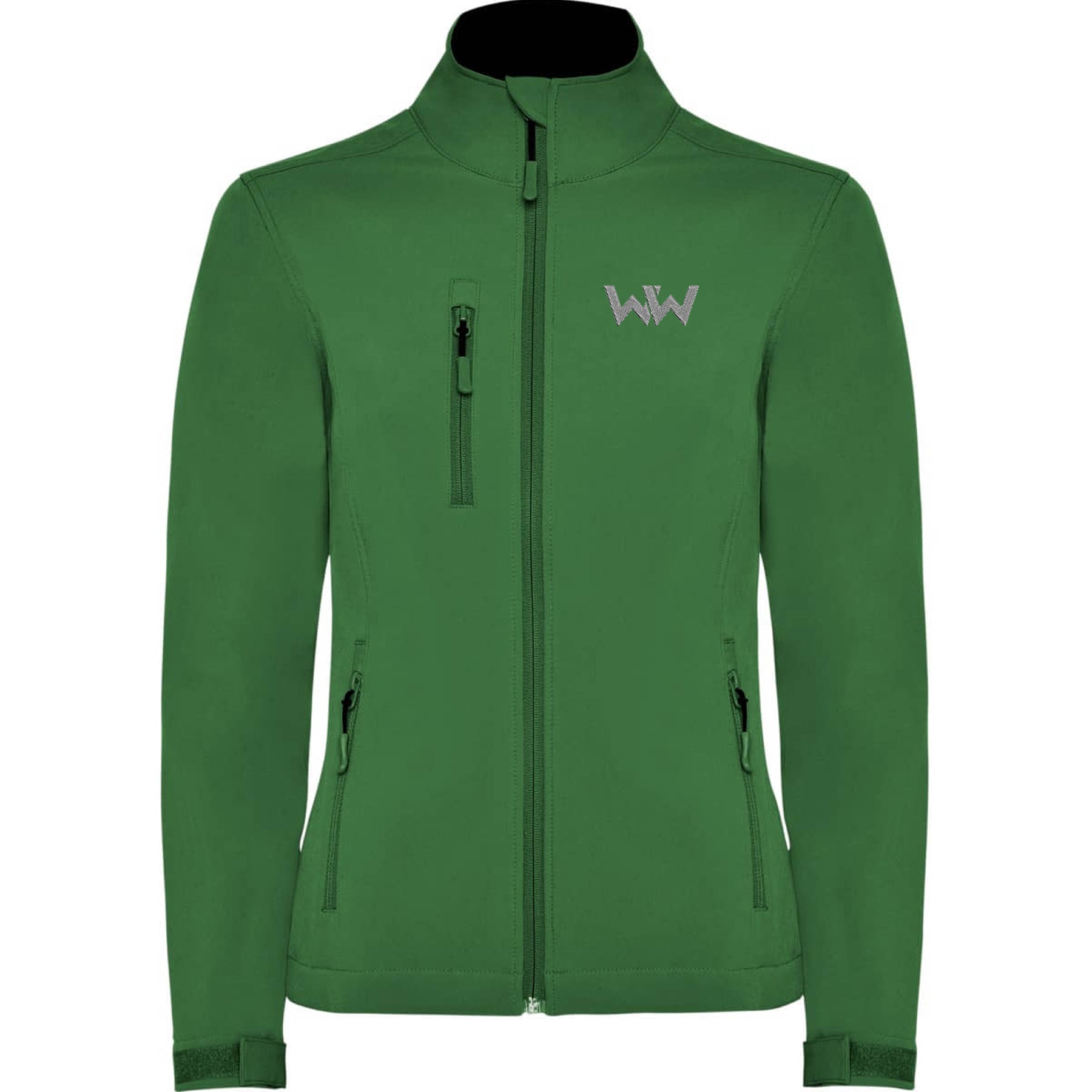 Softshell MOUNTAIN mujer con LOGO BORDADO Verde Botella, corte entallado, compuesto de 2 capas, cremallera invertida a tono, con protector de barbilla y tirador, forro interior en tejido polar, bolsillo exterior en pecho derecho con cremallera a tono y tirador, dos bolsillos exteriores con cremallera a tono y tirador, ajustadores en puño con velcro y bajo con cordón elástico y topes.